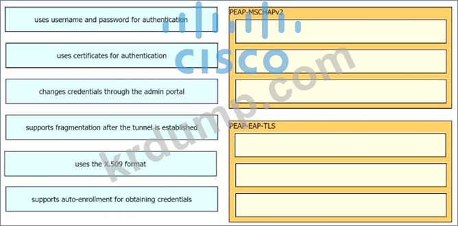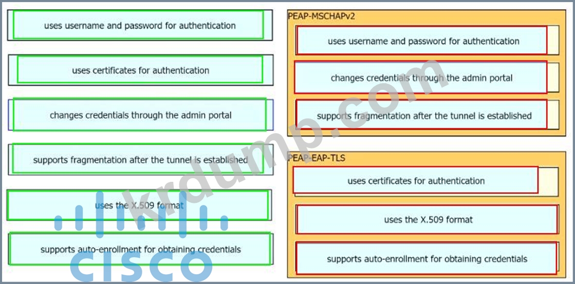 조직에서 802.1X를 구현하려고 하며 인증에 PEAP-MSCHAPv2 또는 PEAP-EAP-TLS를 사용할지 여부를 논의하고 있습니다. 왼쪽의 특성을 오른쪽의 해당 프로토콜로 드래그합니다.