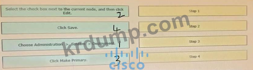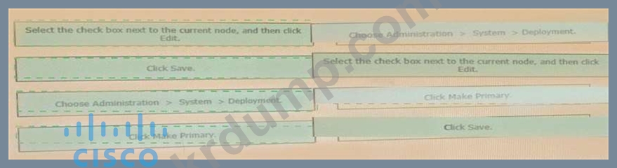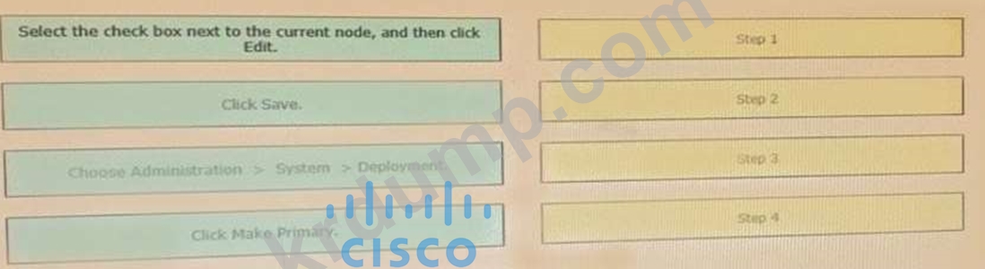 Cisco ISE 노드를 기본 관리 노드로 구성하는 단계를 왼쪽에서 밤에 올바른 순서로 끕니다.