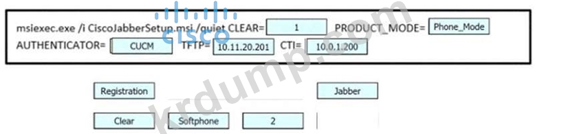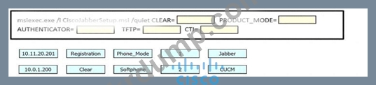 엔지니어는 Cisco UCM을 등록 서버로 사용하고 소프트폰 제어 주소가 10.0.1.200인 전화 시스템용 Jabber 클라이언트 설치 스위치를 구성하고 있습니다. 에서 받은 구성 파일