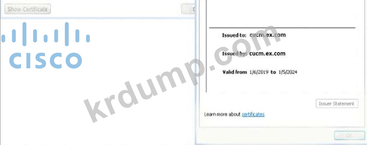 내부 Jabber 로그인 문제를 해결할 때 인증서 오류에 대한 팝업이 표시되고 로그인이 실패합니다. Cisco UCM의 FQDN은 cucm.ex.com입니다. IM and Presence 서버의 FODN은 imp.ex.com입니다. 이 문제를 해결하려면 어떤 두 가지 조치를 취해야 합니까? (2개를 선택하세요.)