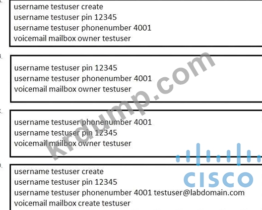 엔지니어는 새로 배포된 Cisco Unity Express 모듈에서 테스트 사용자 메일함을 구성해야 합니다. 이 시나리오에서 올바른 구성을 반영하는 콘솔 명령 세트는 무엇입니까?