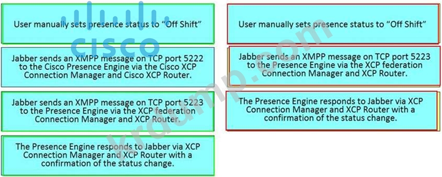 사용자가 Cisco Jabber에서 수동으로 프레즌스 상태를 설정할 때 프레즌스 업데이트 흐름을 설명하는 오른쪽의 올바른 순서로 왼쪽에서 단계를 끌어다 놓습니다. 모든 옵션이 사용되는 것은 아닙니다.
