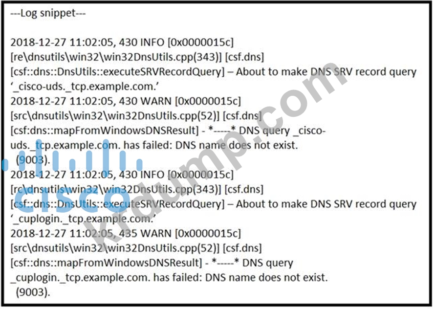 내부 Jabber 로그인 문제를 해결하면 Jabber PRT 파일에서 이 로깅 스니펫을 볼 수 있습니다. Jabber 클라이언트가 올바른 DNS 서버에 연결되어 있는지 이미 확인했습니다. 로그인 프로세스를 계속 진행하기 위해 Cisco Unified Communications Manager의 서비스 검색에 누락된 DNS 레코드는 무엇입니까?