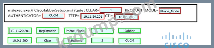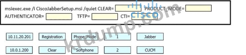 엔지니어는 Cisco UCM을 등록 서버로 사용하고 소프트폰 제어 주소가 10.0.1.200인 전화 시스템용 Jabber 클라이언트 설치 스위치를 구성하고 있습니다. 및 모든 이전 구성이 지워진 후 10.11.20.201에서 받은 구성 파일. 이 구성을 완료하려면 이미지 하단의 스니펫을 이미지의 공백으로 끌어다 놓습니다. 모든 옵션이 사용되는 것은 아닙니다.