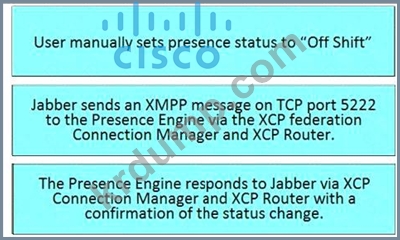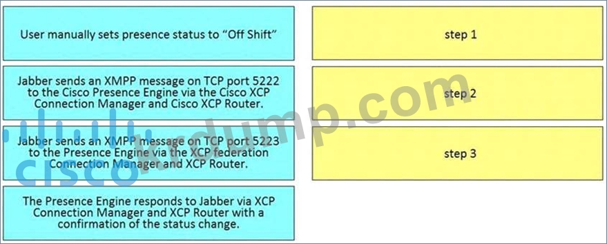 사용자가 Cisco Jabber에서 수동으로 프레즌스 상태를 설정할 때 프레즌스 업데이트 흐름을 설명하는 오른쪽의 올바른 순서로 왼쪽에서 단계를 끌어다 놓습니다. 모든 옵션이 사용되는 것은 아닙니다.