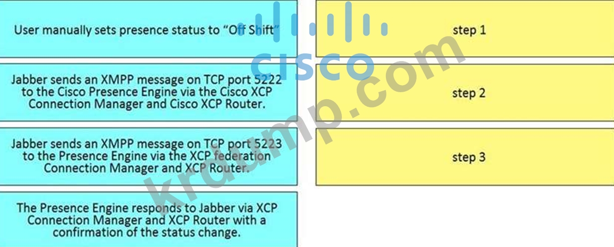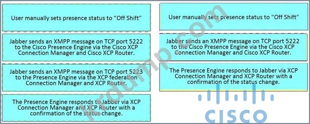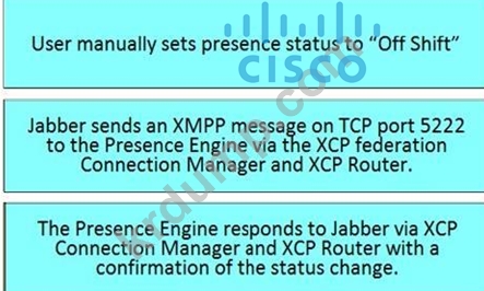 사용자가 Cisco Jabber에서 프레즌스 상태를 수동으로 설정할 때 프레즌스 업데이트 흐름을 설명하는 오른쪽의 올바른 순서로 왼쪽에서 단계를 끌어다 놓습니다. 모든 옵션이 사용되는 것은 아닙니다.