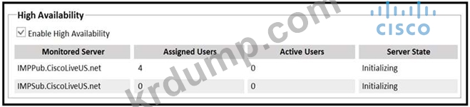 고가용성 모드에서 Cisco IM&P 클러스터를 구성한 후 두 IM&P 서버는 모두 초기화 상태로 유지됩니다. 이 IM&P 고가용성 클러스터의 정상적인 작동을 보장하는 두 가지 작업은 무엇입니까? (2개를 선택하세요.)
