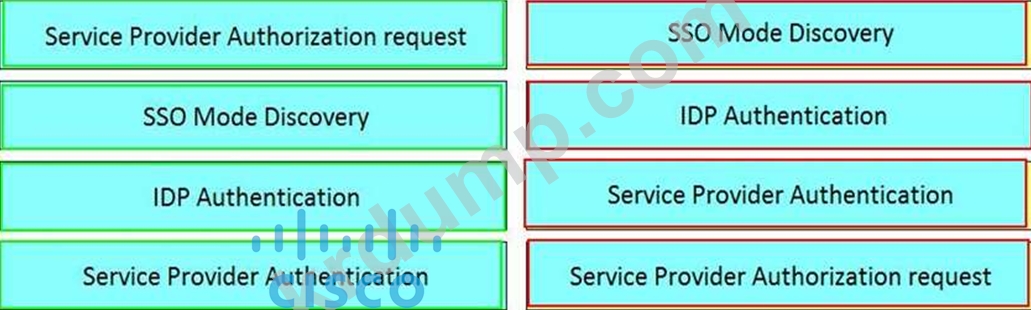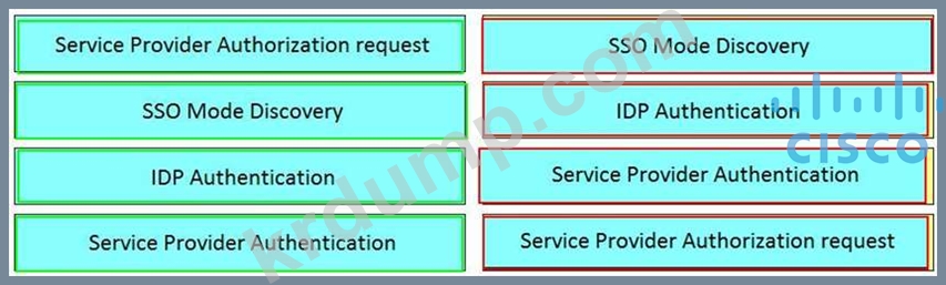 온프레미스 Jabber SAML SSO 흐름에 대한 이벤트를 왼쪽에서 오른쪽의 올바른 순서로 끌어다 놓습니다.