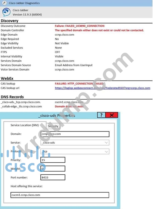 내부 네트워크에 연결된 사용자가 자동 서비스 검색을 사용하여 Cisco Jabber에 로그인을 시도하는 동안 "서버와 통신할 수 없음" 오류를 보고합니다. Jabber 진단 및 SRV 레코드 구성은 전시회에 표시된 대로입니다. 호스트 cucm1.ccnp.cisco.com은 Cisco Unified Communications Manager IP 주소를 사용하는 사용자 데스크톱에서 올바르게 확인됩니다. 사용자가 로그인할 수 없는 이유는 무엇입니까?