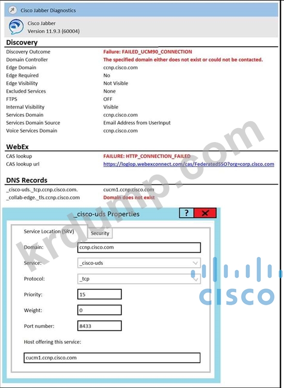 내부 네트워크에 연결된 사용자가 자동 서비스 검색을 사용하여 Cisco Jabber에 로그인을 시도하는 동안 "서버와 통신할 수 없음" 오류를 보고합니다. Jabber 진단 및 SRV 레코드 구성은 전시회에 표시된 대로입니다. 호스트 cucm1.ccnp.cisco.com은 Cisco Unified Communications Manager IP 주소를 사용하는 사용자 데스크톱에서 올바르게 확인됩니다. 사용자가 로그인할 수 없는 이유는 무엇입니까?