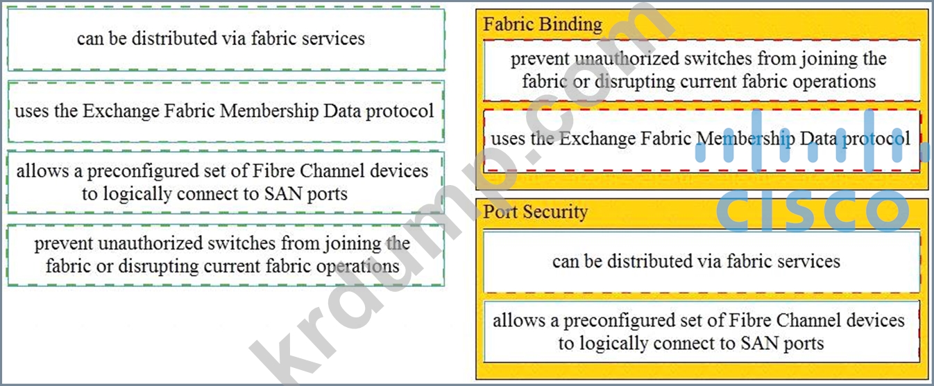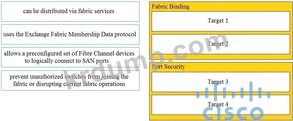 엔지니어가 Cisco MDS 9000 스위치에 보안을 구현하고 있습니다. 왼쪽의 설명을 오른쪽의 해당 보안 기능에 끌어다 놓으세요.
