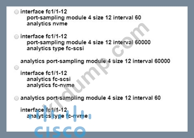 Cisco MDS 9000 시리즈 스위치는 SAN 분석 및 SAN 원격 분석 스트리밍을 위해 구성되어 있습니다. 엔지니어는 fc1/1~12 범위의 인터페이스에서 NVMe에 대한 분석을 활성화해야 합니다. SAN 환경에서 발생하는 트래픽 양이 많으므로 fc 1~12 포트에서 60초 간격으로 데이터를 수집하고, 그 후 fc13~24 포트에서도 60초 동안 데이터를 수집해야 합니다. fc4/13~14 범위의 포트는 이미 분석 기능이 활성화되어 있습니다. 이러한 요구 사항을 충족하려면 어떤 명령 세트를 사용해야 합니까?