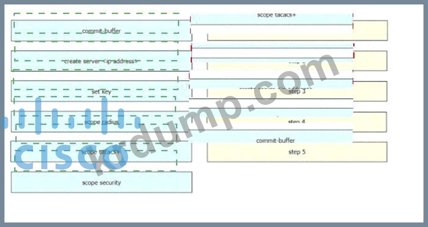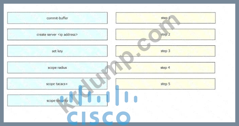 엔지니어는 Cisco UCS 시스템에서 원격 인증을 구성해야 합니다. 사용자 비밀번호는 인증 서버로 전송되기 전에 암호화되어야 합니다. 회사 보안 정책에 따라 서버는 개방형 표준을 기반으로 해야 합니다. 왼쪽에서 오른쪽에 구현해야 하는 순서대로 UCS CLI AAA 구성 명령을 끌어다 놓으세요. 모든 명령이 사용되는 것은 아닙니다.