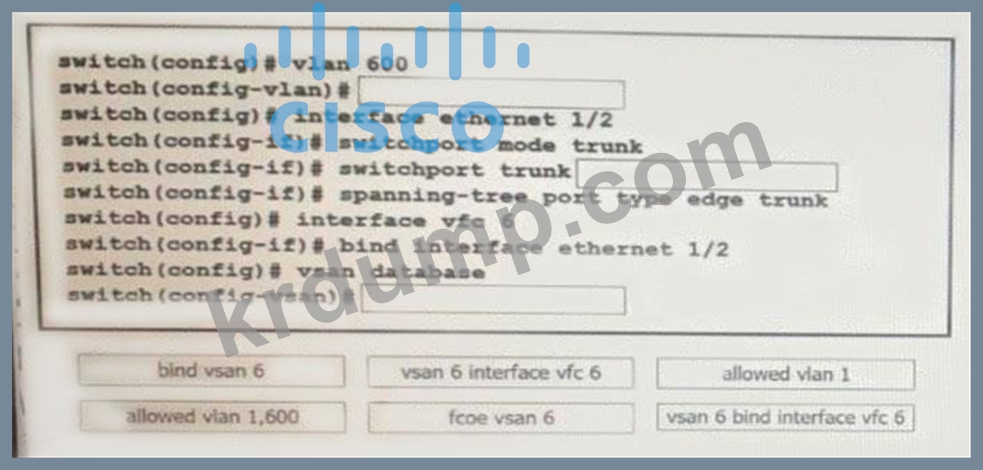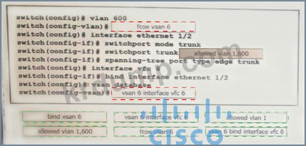 네트워크 엔지니어는 Cisco MDS 9000 시리즈 스위치의 인터페이스에서 FCoE를 구성해야 합니다. 이 구성은 VLAN 600과 VSAN 6 간의 매핑에 사용되어야 합니다. FCoE 구성에서 하단의 명령을 구현 순서대로 드래그 앤 드롭하세요. 모든 명령이 사용되는 것은 아닙니다.