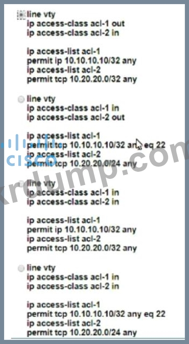 엔지니어는 이러한 요구 사항을 충족하기 위해 Cisco Nexus 9000 시리즈 스위치에 대한 원격 SSH 관리 연결을 구성해야 합니다. 연결은 IP 주소가 10 10.10 10/24인 점프 호스트에서 허용되어야 합니다. 모든 스위치는 10.20.20.0/24 서브넷에서 다른 장치에 SSH를 통해 연결할 수 있어야 합니다.