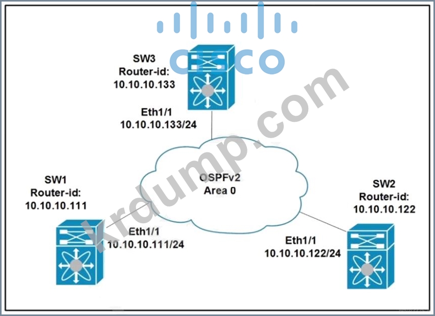 모든 스위치는 기본 OSPF 우선순위로 구성됩니다. SW2 Cisco Nexus 스위치가 LSA 플러딩을 제어하고 OSPFv2 영역의 나머지 노드에 네트워크를 광고하도록 하려면 어떤 구성을 적용해야 합니까?