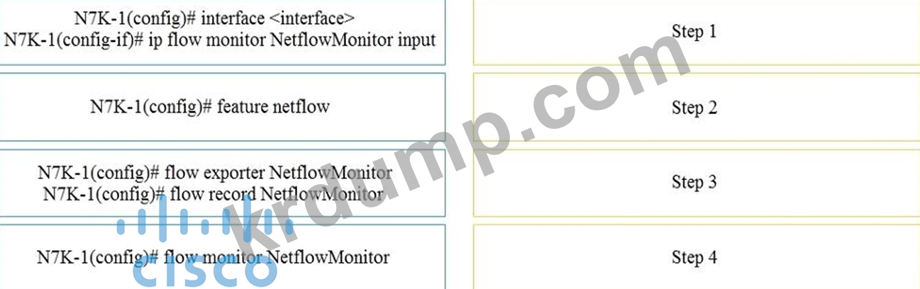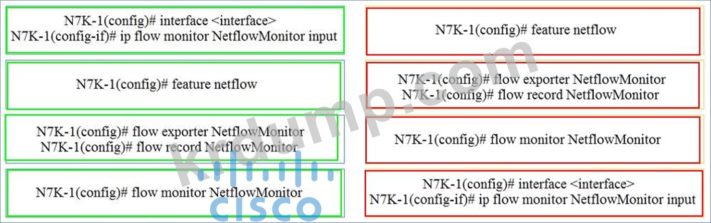 엔지니어가 Cisco Nexus 7000 시리즈 스위치에 NetFlow를 구현하고 있습니다. 왼쪽의 NetFlow 명령을 오른쪽에 입력해야 하는 올바른 순서대로 끌어다 놓으세요.