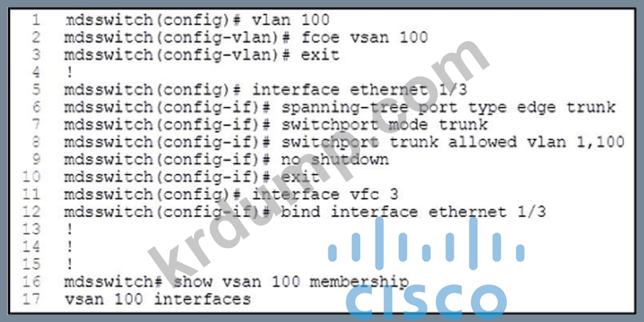 그림을 참조하세요. SAN 엔지니어가 Cisco MDS 9000 시리즈 스위치에 FCoE를 구성하고 있습니다.