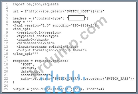 그림을 참조하세요. 엔지니어는 Cisco NX-API CLI를 사용하여 Cisco Nexus 9000 시리즈 스위치의 호스트 이름을 구성하는 Python 스크립트를 작성해야 합니다. 스크립트의 출력은 JSON으로 인코딩되어야 합니다. 5번째 줄의 어떤 스니펫 코드가 스크립트를 완성합니까?