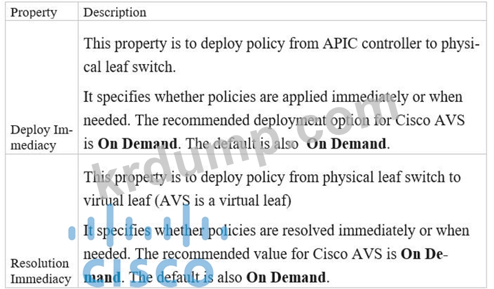 EPG에 연결된 VMM 도메인의 배포 즉시성에 대한 설명 중 맞는 것은 무엇입니까?