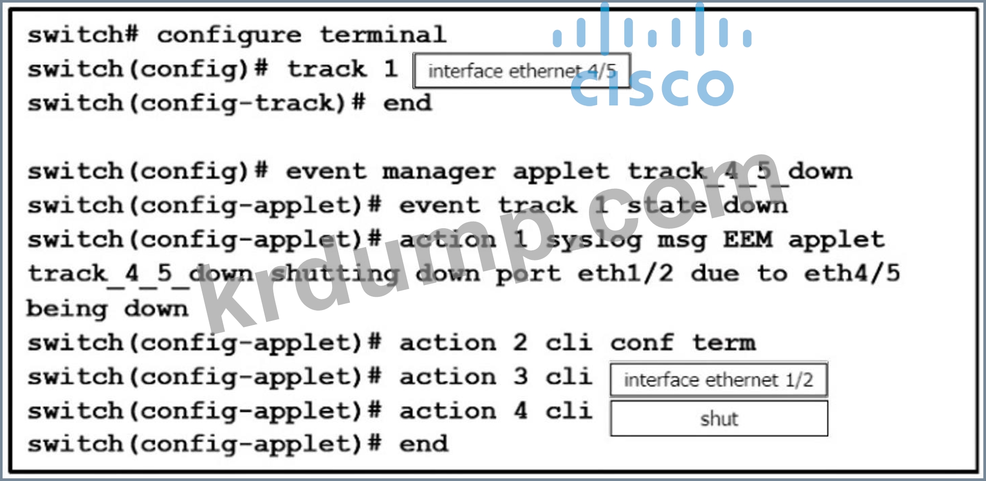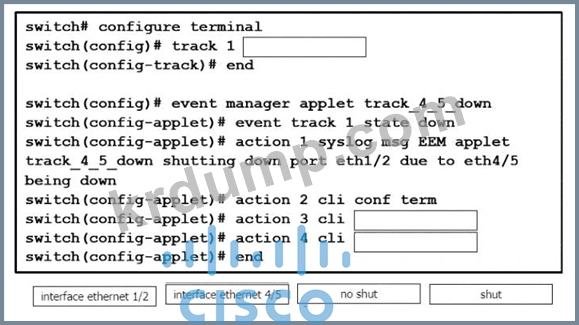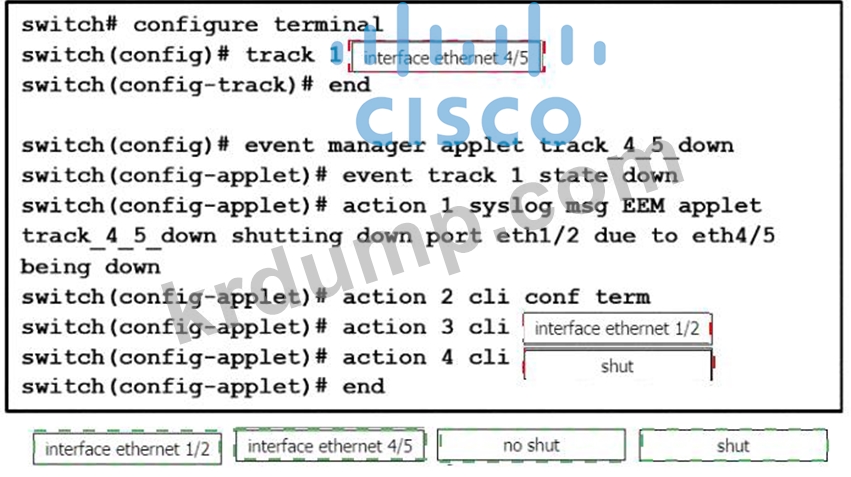 엔지니어는 이더넷 4/5 인터페이스가 다운되면 이더넷 1/2 인터페이스를 종료해야 합니다. 이 EEM을 구현하려면 하단의 CLI 명령을 그림의 빈칸으로 끌어다 놓으세요. 모든 명령이 사용되는 것은 아닙니다.