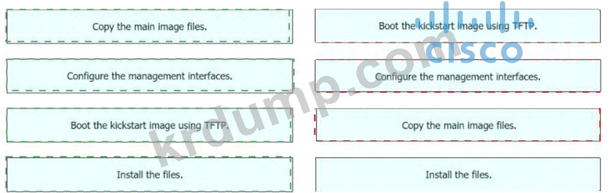 부트플래시에 작동 이미지가 없는 경우 패브릭 상호 연결을 복구하려면 왼쪽의 단계를 오른쪽에서 구현해야 하는 순서대로 끌어다 놓습니다.