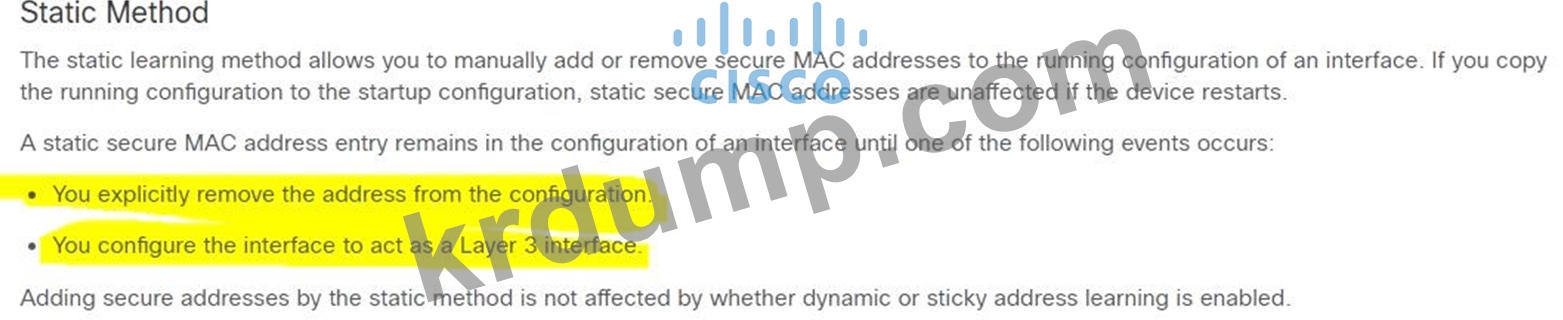 Cisco Nexus 7700 시리즈 스위치와 F3 라인 카드에 포트 보안이 정적으로 구성되어 있습니다. 이 스위치는 고급 서비스 라이선스로 구성되어 있습니다. 인터페이스에서 보안된 MAC 주소를 삭제하는 두 가지 동작은 무엇입니까? (두 가지 선택)
