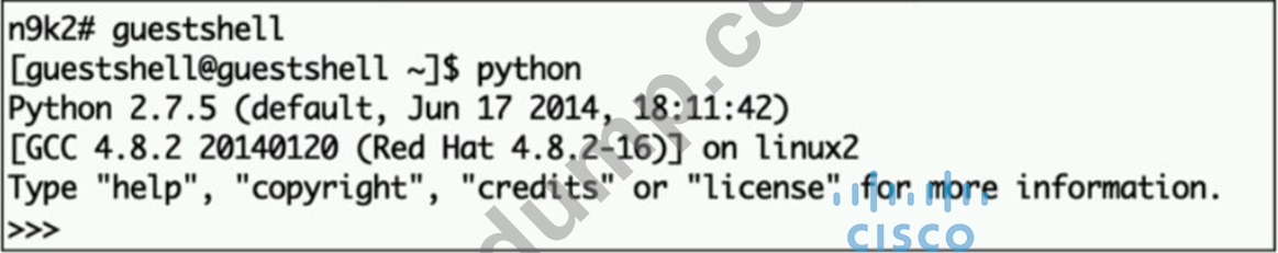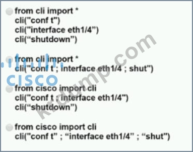 엔지니어는 Cisco Nexus 9000 시리즈 스위치의 게스트 셸에서 Python 모듈을 사용하여 이더넷 포트 1/4를 종료해야 합니다. 어떤 명령 세트가 이를 달성할 수 있을까요?