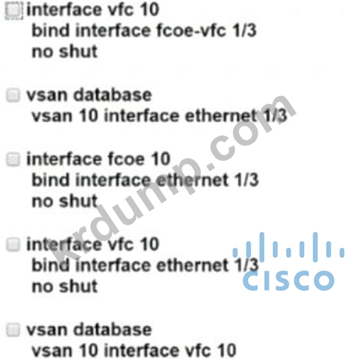 엔지니어가 Cisco Nexus 스위치에서 FCoE를 구성해야 합니다. 이 구성을 완료하는 두 가지 명령 세트는 무엇입니까? (두 가지 선택)