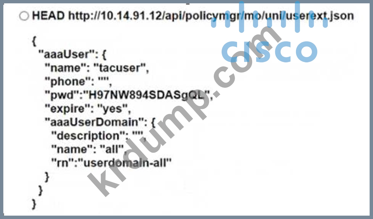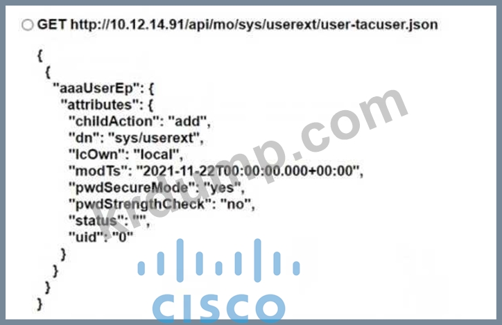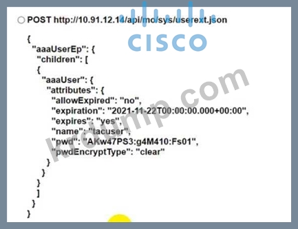 엔지니어가 NX-OS API를 사용하여 Cisco Nexus 9000 시리즈 스위치를 자동화하고 있습니다. 만료일이 11월 22일인 "tacuser"라는 로컬 사용자를 생성하는 코드 조각은 무엇입니까?