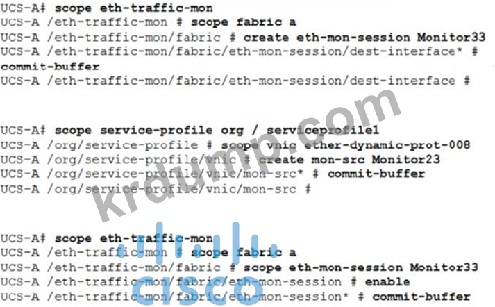 Cisco UCS 블레이드 서버에 배포된 VM에서 서비스 저하가 보고되었습니다. vNIC에서 발생하는 트래픽은 UCS-A 슬롯 2 포트 12에 연결된 패킷 분석기로 양방향으로 SPAN되어야 합니다. 구성을 완료하는 데 필요한 두 가지 명령은 무엇입니까? (두 개 선택)