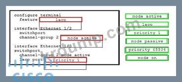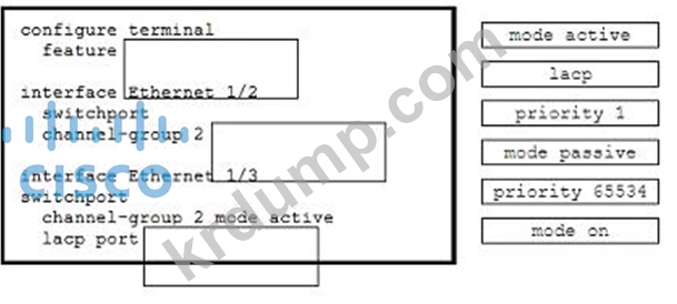 엔지니어는 두 대의 Cisco Nexus 7000 시리즈 스위치에 LACP 포트 채널을 구성해야 합니다. 인터페이스 e1/2는 다른 포트와 협상을 시작하는 핫 스탠바이 링크여야 합니다. 오른쪽의 명령을 왼쪽 구성의 빈칸으로 끌어다 놓으세요. 모든 명령이 사용되는 것은 아닙니다.