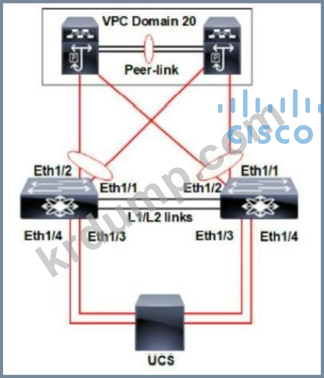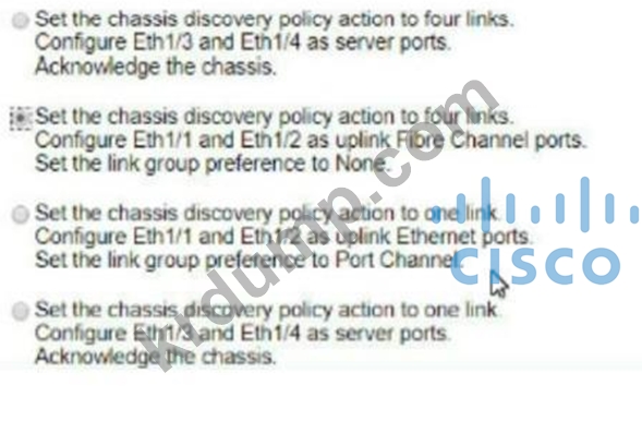 그림을 참조하십시오. Cisco Nexus 스위치 한 쌍이 vPC를 구성합니다. 기존 Cisco UCS 도메인에 새 섀시가 추가됩니다. 새 섀시를 검색하고 섀시에서 LAN 네트워크로의 모든 링크를 설정해야 합니다. 이러한 요구 사항을 충족하는 작업은 무엇입니까?