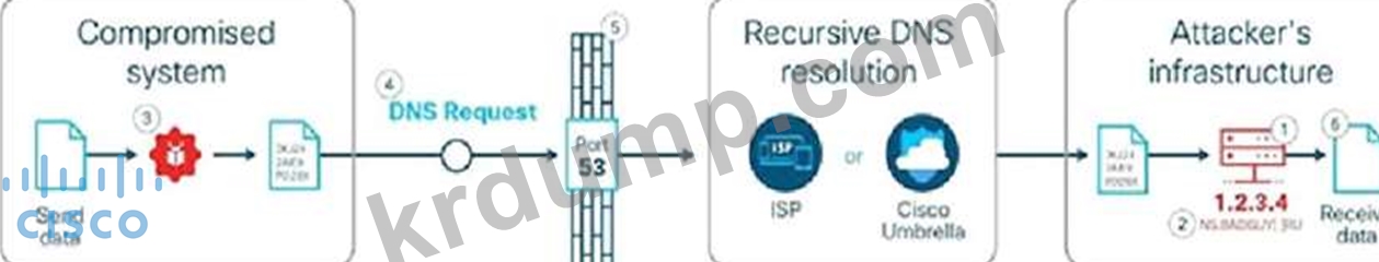 도메인 이름의 일부(예: 3KJ242AIE9.attackerdomain.com). 공격자의 인내심과 은밀성에 따라 의심스러운 네트워크 활동을 피하기 위해 요청을 며칠 또는 몇 달에 걸쳐 간격을 둘 수 있습니다. 5. 요청이 재귀적 DNS 확인자로 전달됩니다. 확인하는 동안 요청은 공격자의 권한이 있는 DNS 이름 서버인 6으로 전송됩니다. 터널링 키트는 인코딩된 문자열을 구문 분석하고 추출된 데이터를 다시 작성합니다. 참조: https://learn-umbrella.cisco.com/i/775902-dns-tunneling/0