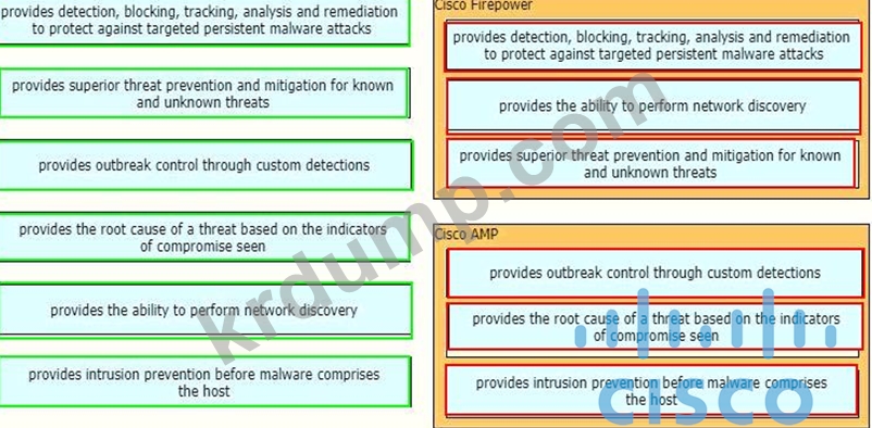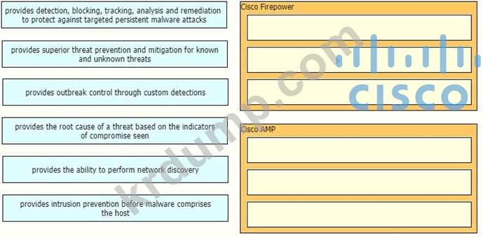 왼쪽에서 Cisco Firepower 대 Cisco AMP의 기능을 오른쪽의 적절한 범주로 끌어다 놓습니다.