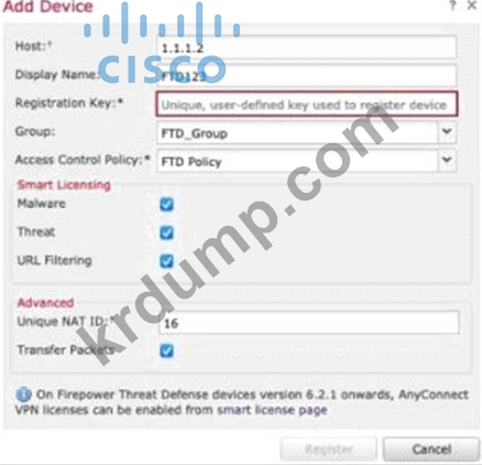 관리자가 새 Cisco FTD 장치를 네트워크에 추가하고 Cisco FMC로 관리하려고 합니다.