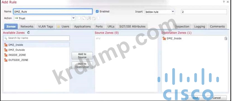 Cisco FMC에서 이 액세스 제어 규칙을 구성할 때 구성이 배포되면 DMZjnside 영역으로 향하는 트래픽은 어떻게 됩니까?
