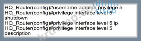 네트워크 관리자는 admin5 사용자에 대한 명령 권한 부여를 구성합니다. 이 구성 후 admin5 사용자는 HQ_Router에서 무엇을 할 수 있습니까?