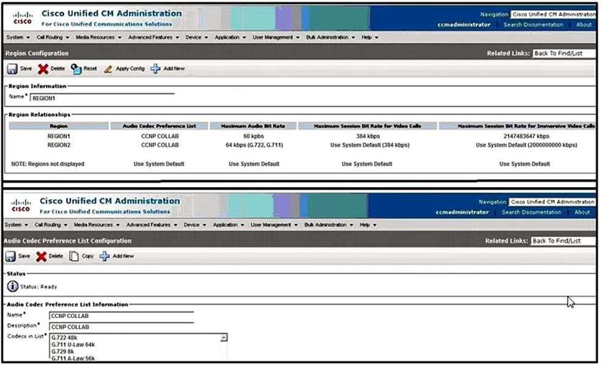 전시회를 참조하십시오. 엔지니어는 통화와 관련된 두 엔드포인트가 전시회에 나열된 코덱을 지원하는 코덱 협상 문제를 해결하고 있습니다. Region1의 두 끝점 간에 호출이 있는 경우 어떤 오디오 코덱이 선택됩니까?