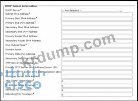 전시회를 참조하십시오. 엔지니어는 Cisco UCM의 Cisco 서비스에서 DHCP 서비스를 구성해야 합니다. 엔드포인트에 구성 파일을 제공하기 위해 엔지니어는 어느 필드에서 서버 IP를 구성해야 합니까?
