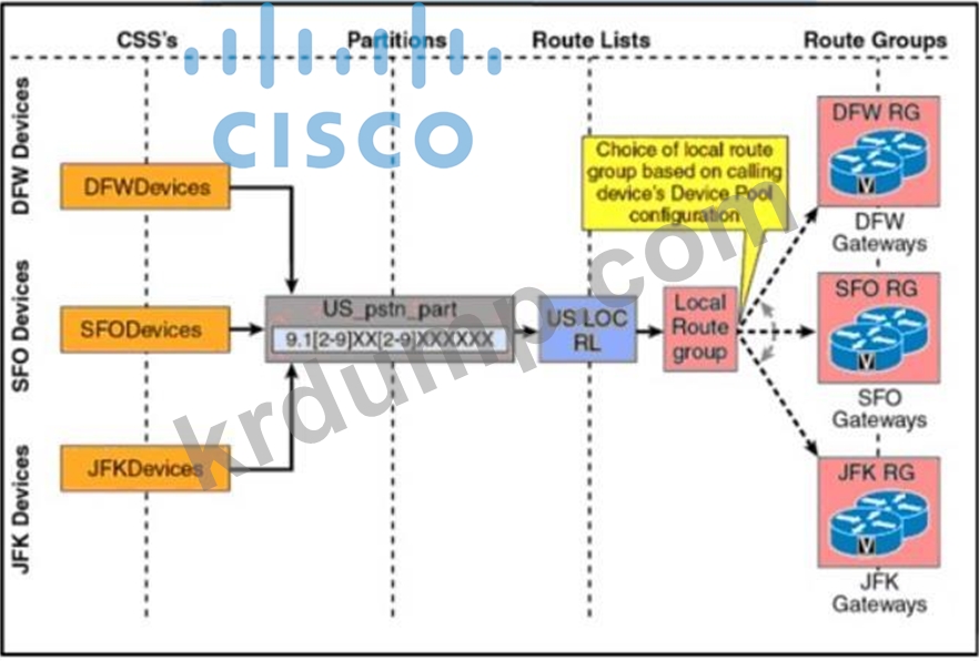 그림을 참조하십시오. 사용자가 샌프란시스코에서 뉴욕으로 전화기를 가져와 단기 재할당을 요청합니다. 전화기는 샌프란시스코 장치 풀을 사용하도록 설정되었으며, Cisco UCM에서 장치 모빌리티가 활성화되어 있습니다. 사용자는 표준 로컬 경로 그룹이 포함된 경로 목록의 경로 패턴과 일치하는 전화를 겁니다. 통화는 어디로 연결됩니까?