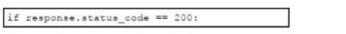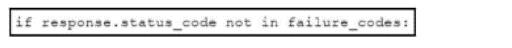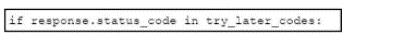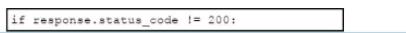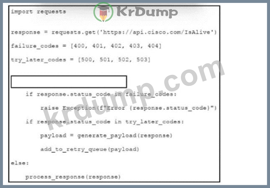 Refer to the exhibit. An engineer is developing a Python script to check if an API is live If the API is not live, the script must evaluate the response code and either raise an exception or add the request to a queue for retry. Which code snippet must be placed in the plank in the code to complete the script?