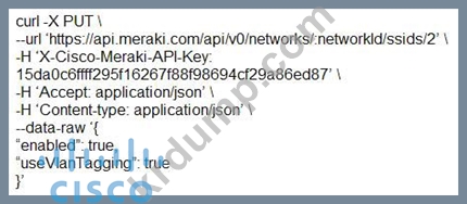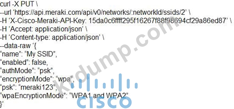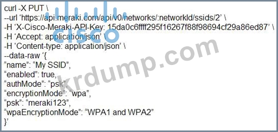 Meraki API를 사용하여 SSID를 구성, 보호 및 활성화하기 위한 올바른 API 호출을 나타내는 스니펫은 무엇입니까?