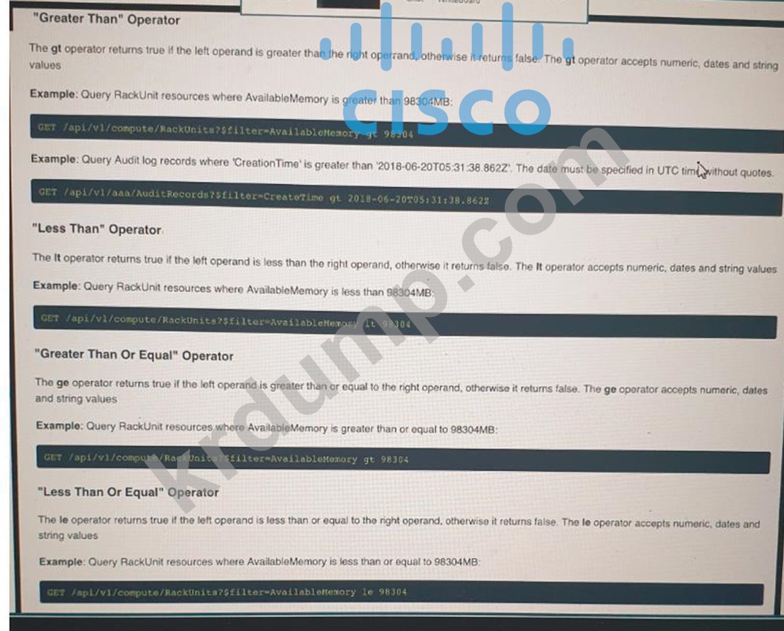 이 질문에 도움이 될 리소스를 보려면 위의 리소스 가져오기 버튼을 클릭하십시오. 엔지니어는 6000개의 Cisco UCS 서버가 설치되어 실행 중인 DC를 관리하고 있습니다. 엔지니어는 모델이 UCSB 제품군에 있고 사용 가능한 메모리가 5GB 이하인 모든 리소스를 식별하라는 요청을 받았습니다.