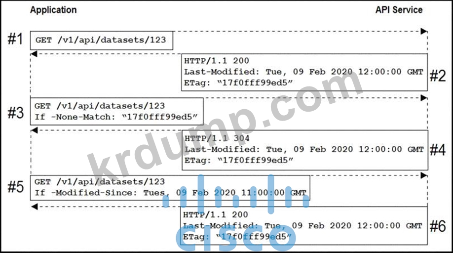 애플리케이션은 API를 사용하여 대규모 데이터 세트를 주기적으로 동기화합니다. 제공된 HTTP 메시지 시퀀스를 기반으로 시나리오에서 볼 수 있는 캐싱 동작에 대한 설명으로 옳은 것은? (2개를 선택하세요.)