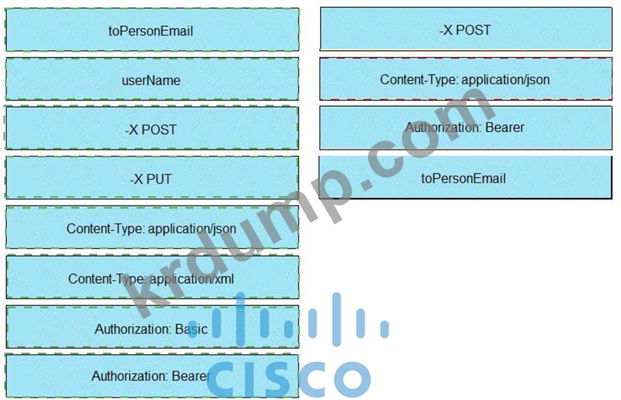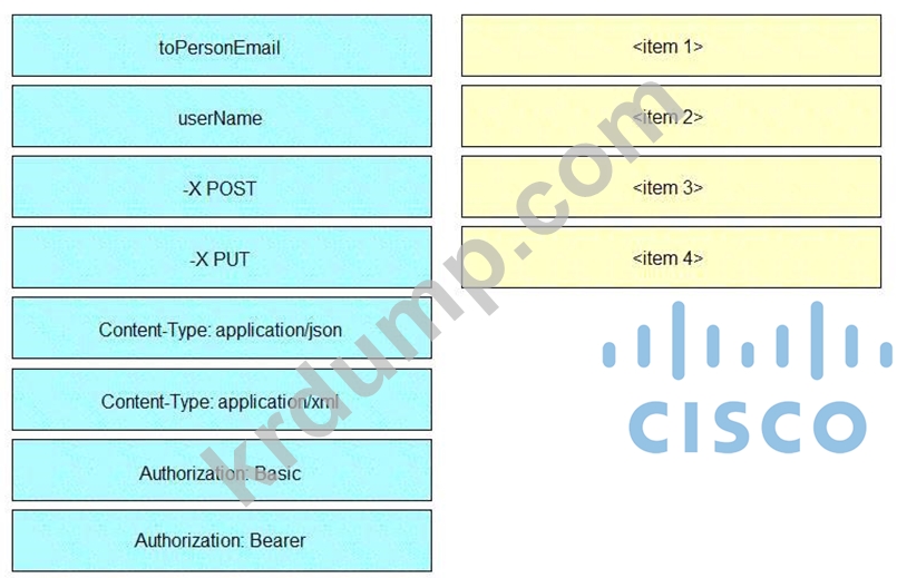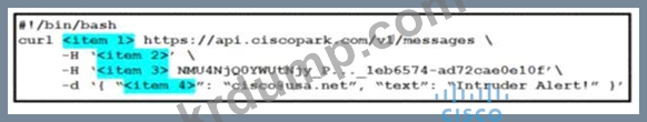 전시를 참고하세요. 시스템 관리자는 침입자가 감지될 때 Bash 셸 스크립트를 실행할 수 있는 Linux 기반 경보 시스템을 집에 설치했습니다. 왼쪽의 코드 조각을 전시회의 누락된 섹션과 일치하는 오른쪽의 항목 번호로 드래그 앤 드롭하여 Webex Teams REST API를 통해 알람을 알리는 chat-ops 스크립트를 생성하십시오. 모든 코드 조각이 사용되는 것은 아닙니다.