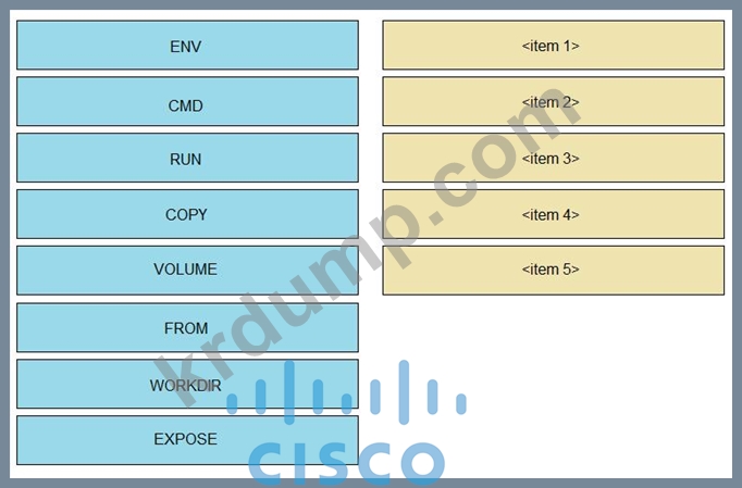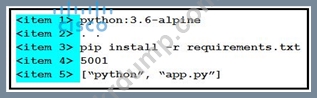 Dockerfile의 올바른 부분을 왼쪽에서 전시회의 누락된 섹션과 일치하는 오른쪽의 항목 번호로 끌어다 놓아 Dockerfile을 완료하여 Python 애플리케이션을 실행하는 컨테이너를 성공적으로 빌드 및 배포합니다. Dockerfile의 모든 부분이 사용되는 것은 아닙니다.