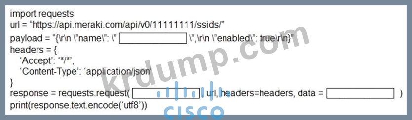 Meraki 대시보드 API를 사용하여 네트워크 리소스 "11111111"에서 이름이 "376699609"인 SSID를 활성화하는 Python 스크립트를 완료하려면 공백을 채우십시오.