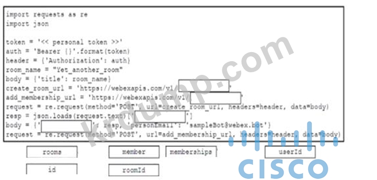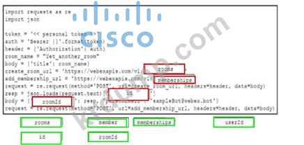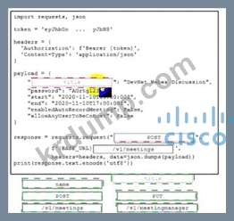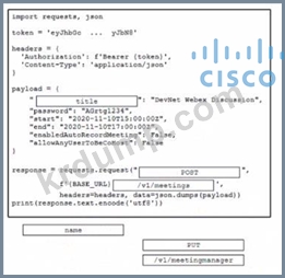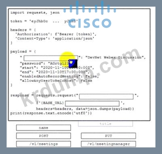 Webex API를 사용하여 Cisco Webex 미팅을 생성하려면 하단의 코드 스니펫을 코드가 누락된 상자로 끌어다 놓습니다. 모든 옵션이 사용되는 것은 아닙니다.