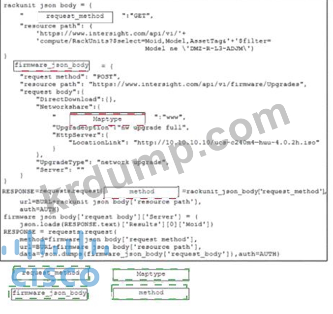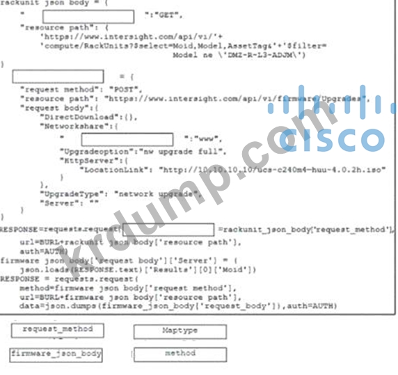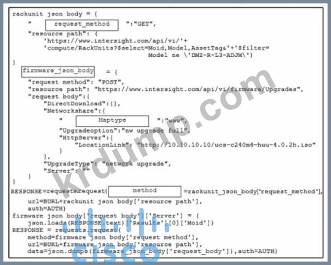 이 질문에 도움이 되는 리소스를 보려면 왼쪽 상단 모서리에 있는 리소스 랩을 클릭하십시오. 스크립트는 Cisco Intersight REST API를 사용합니다. 특정 Cisco interaght 관리형 UCS 랙 서버인 DMZ-RL3ADJM에서 펌웨어를 업데이트합니다.